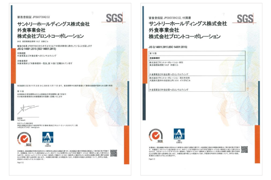 プロントコーポレーションは、2009年にプロントグループの各店舗と東京本社・西日本支社でおいて環境マネジメントシステムの国際規格ISO 14001(2004年版)を取得しました。