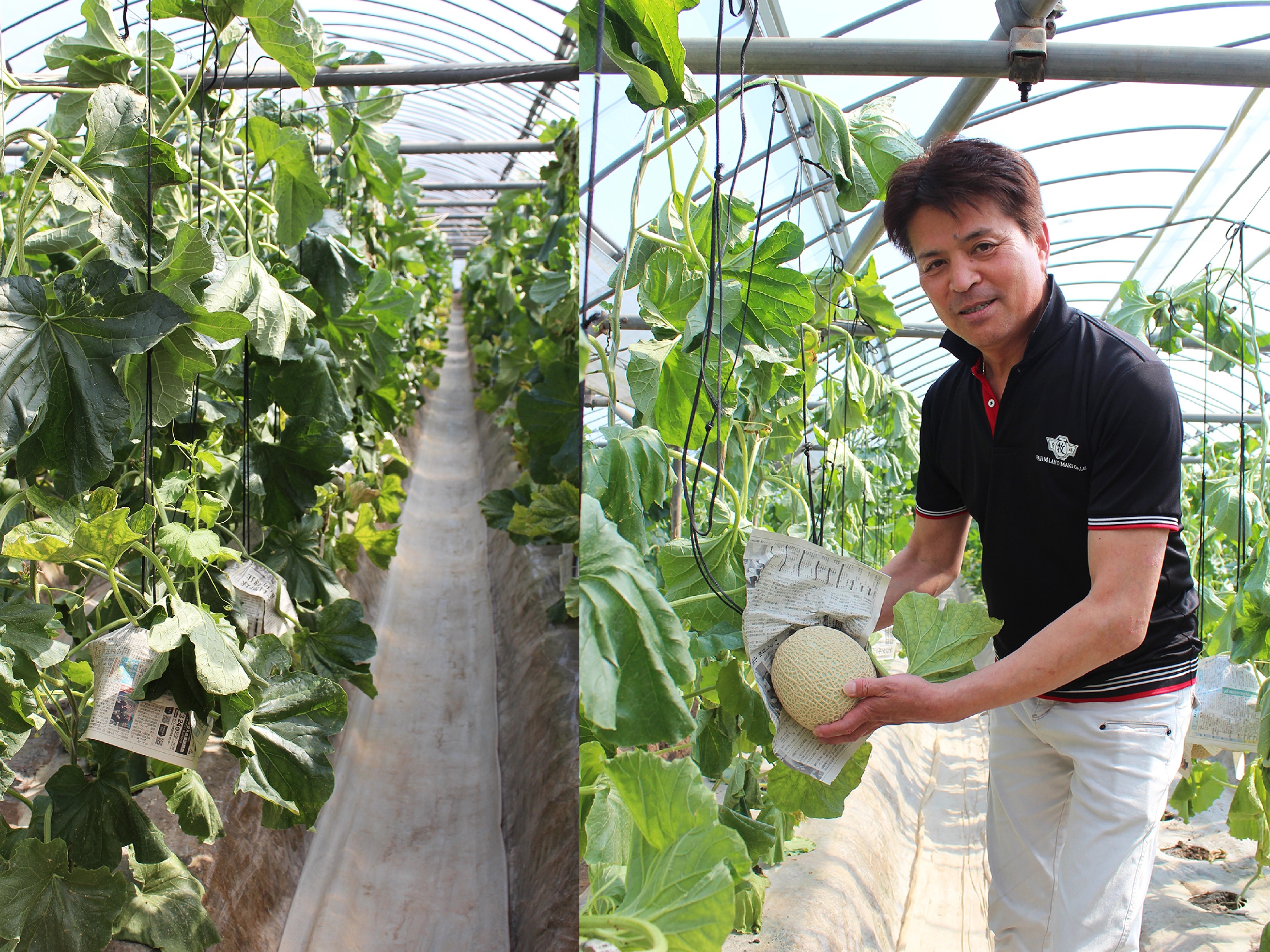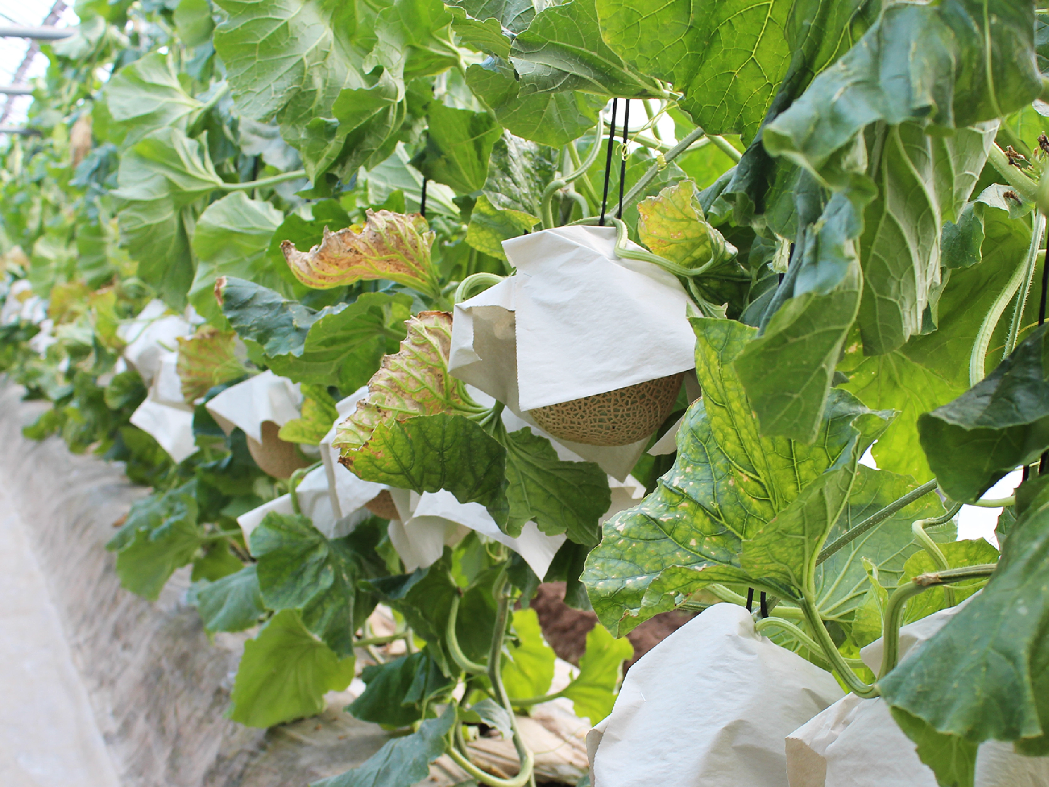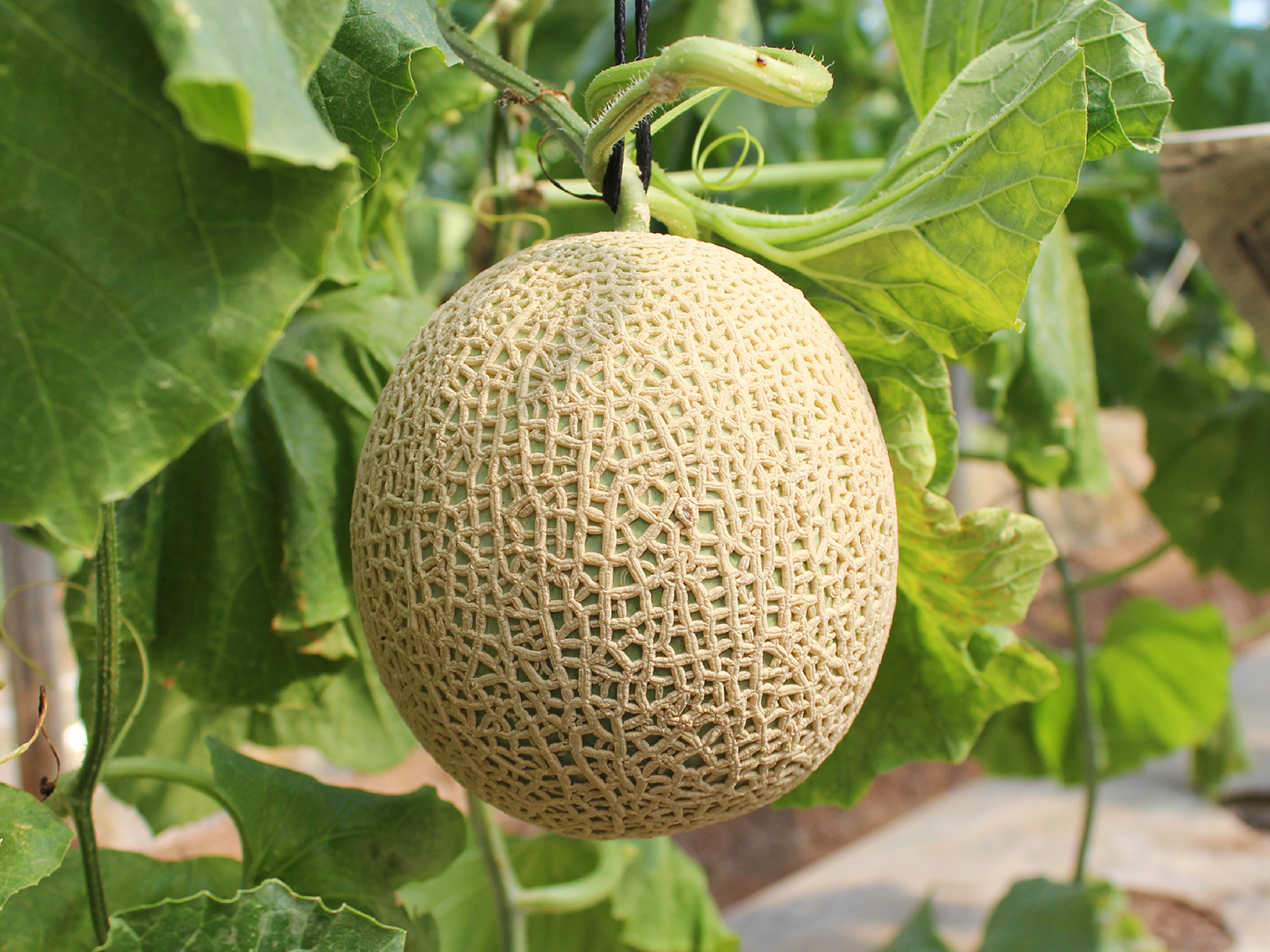 栽培方法としては、「立体栽培」というメロンをつるして空中で育てる方法を採用しています。1本の樹のうち咲いた花の中から残されるのは1つだけ。栄養を集中させることで、15度以上という高い糖度のメロンを作っています。