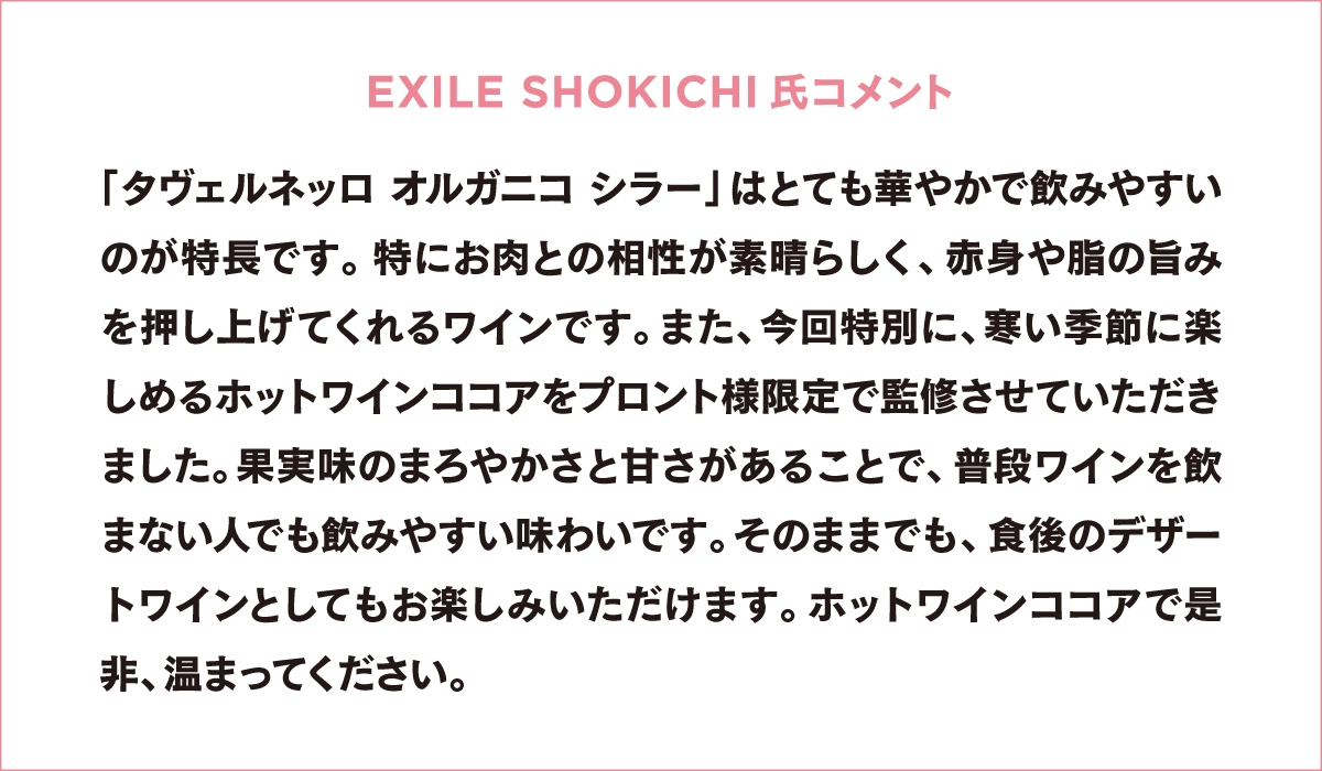EXILE SHOKICHI 氏 監修 「タヴェルネッロ オルガニコ シラー」